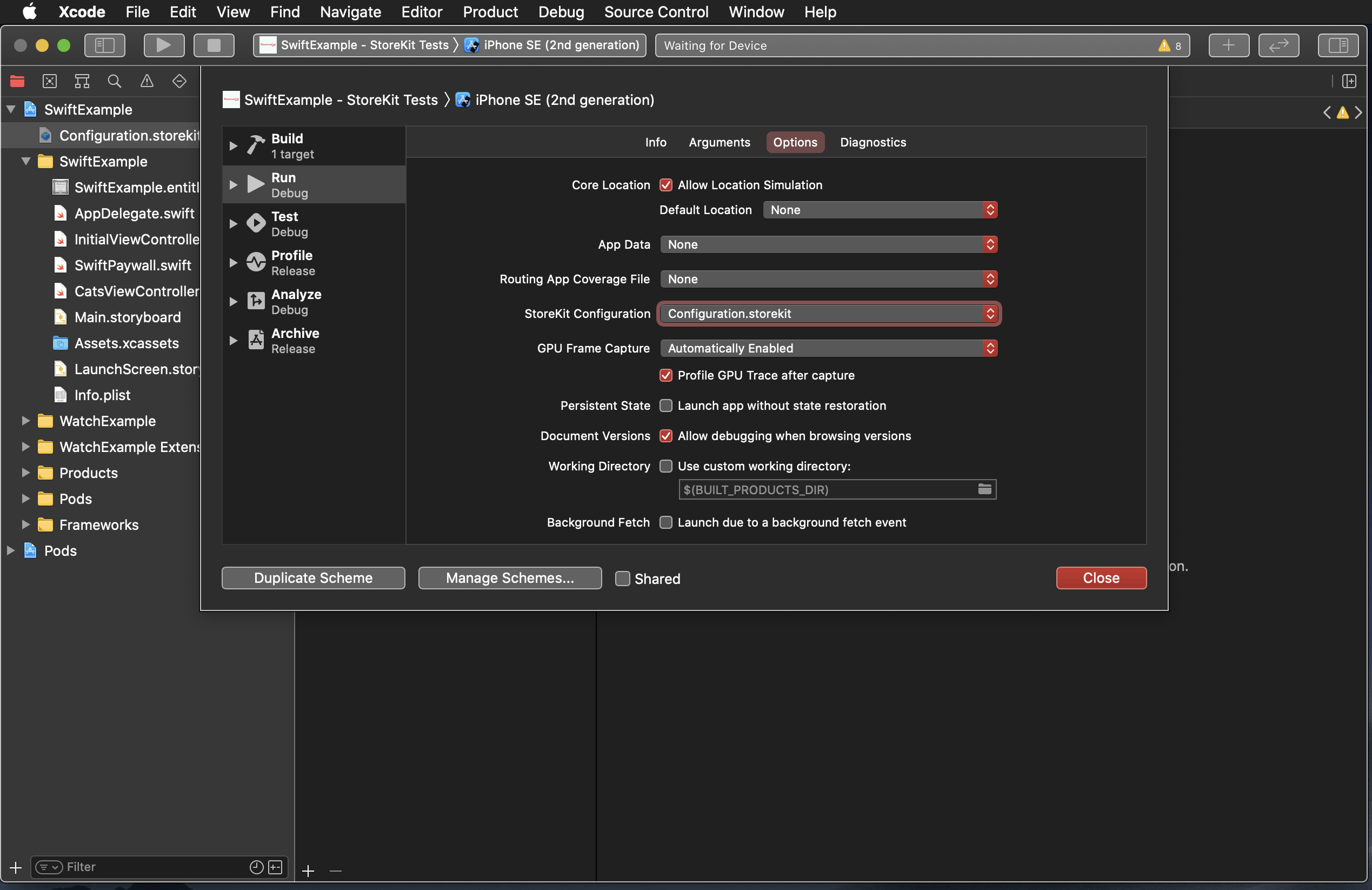 In the scheme editor, add the StoreKit Configuration file you created in [Step 1](/test-and-launch/sandbox/apple-app-store#ste p-1-add-a-storekit-configuration-file) and click Close.