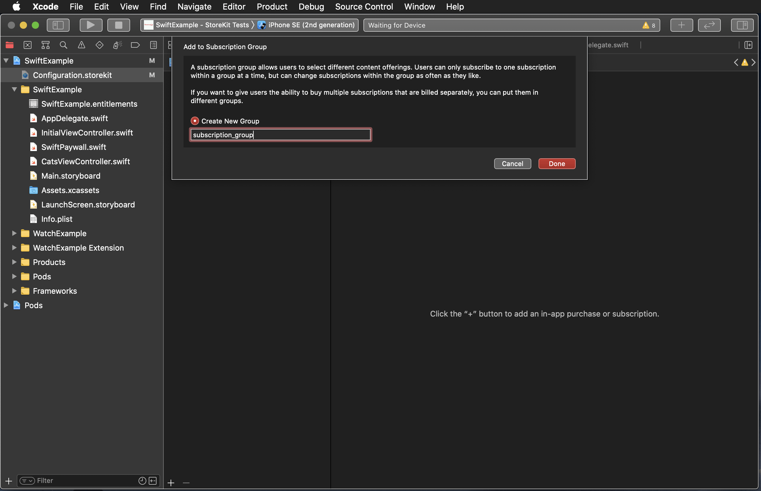 Enter a name for a new subscription group and click Done. The subscription group name should match one that is set up for your app in App Store Connect, but it's not a requirement. That means you can test your subscription groups and products in the simulator and then create the products in App Store Connect later.