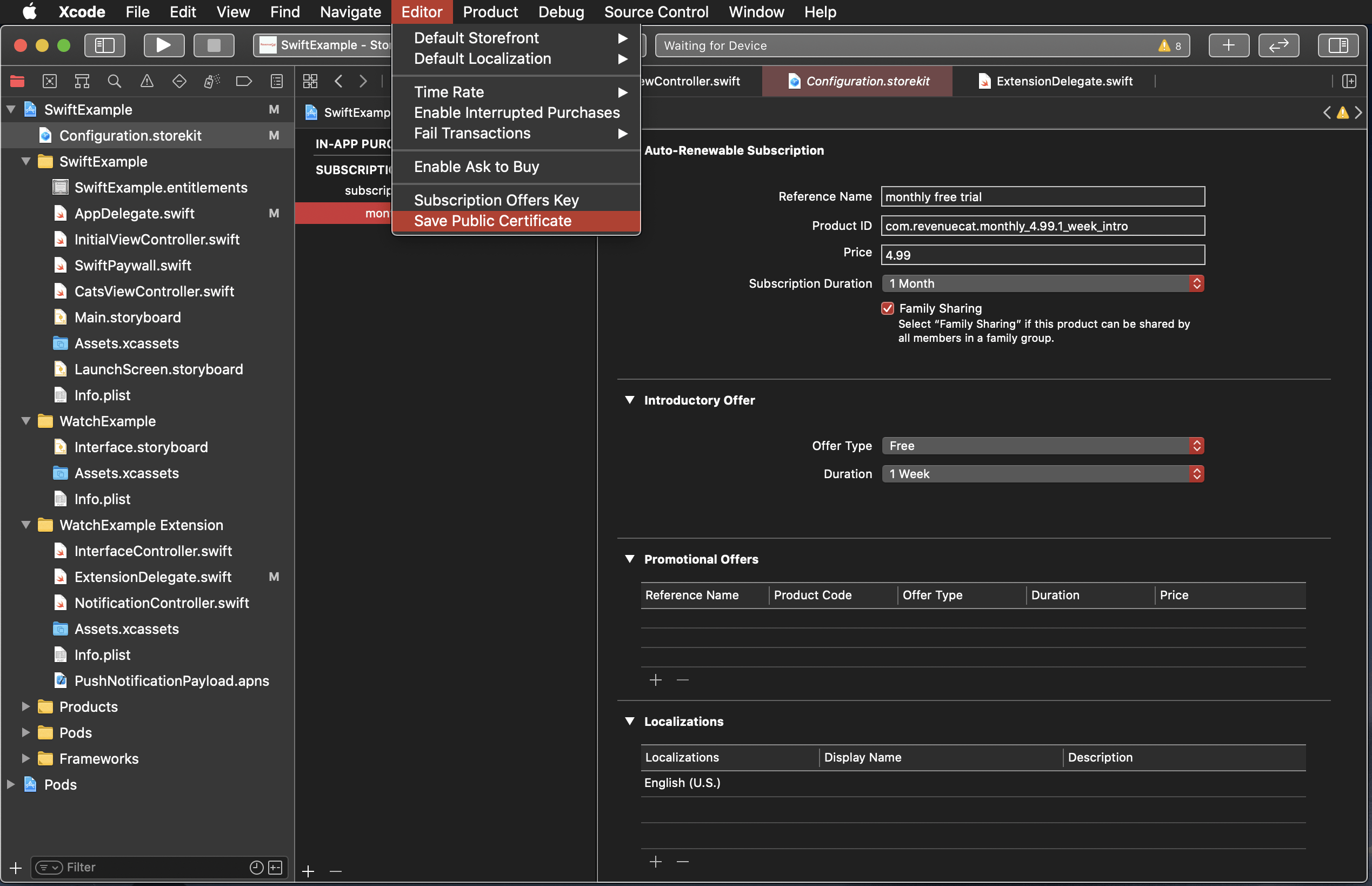 Note that the private key stored in the “.storekit” file is unique per file and Xcode allows you to re-generate the key for a given file. If you re-generate your key, be sure to follow these steps again to upload your new key to RevenueCat.
