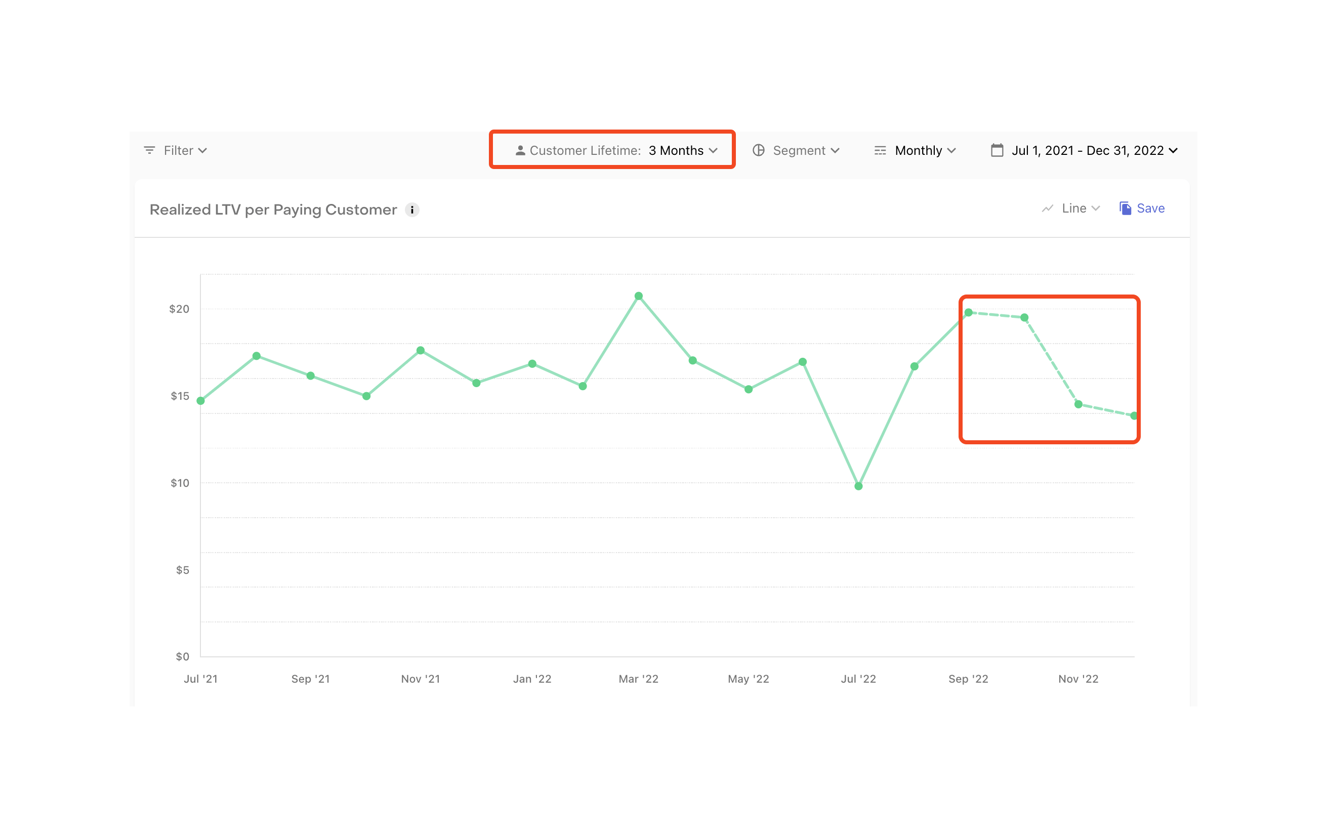 The Customer Lifetime selector limits the time that a cohort has to mature in order for its revenue to be include in lifetime value (LTV). This allows for accurate comparisons of realized LTV between periods, where each cohort has been given equal time to mature.