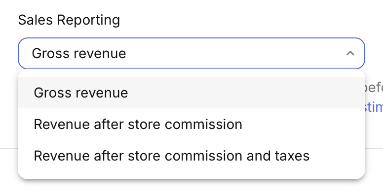 For integrations which report revenue you’ll see the option to select a Sales reporting mode for the integration. Selecting either “Revenue after store commission” or “Revenue after store commission and taxes” will apply the respective calculations to your data so that your sales are reported in a format that is most appropriate for your use case.