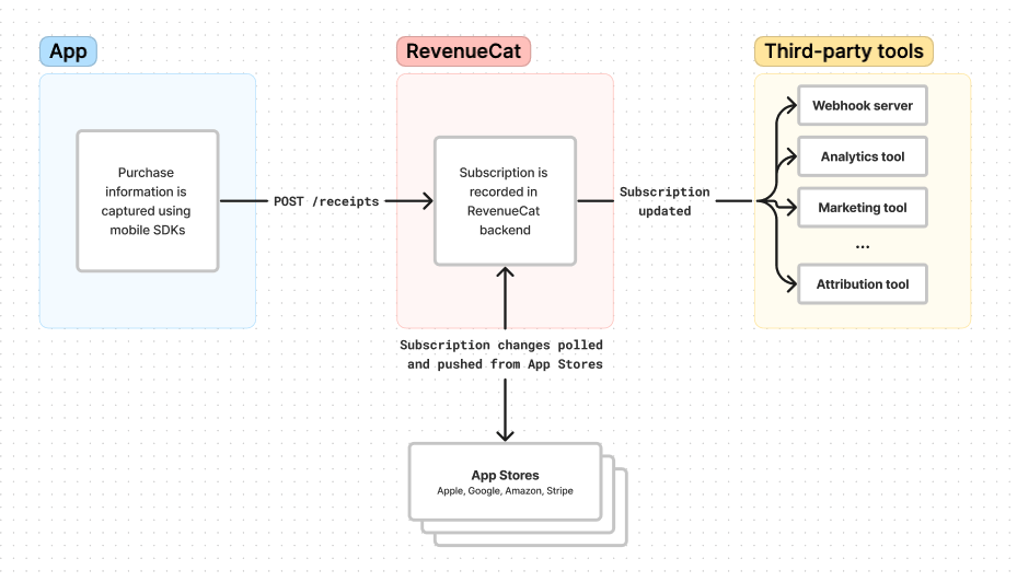 RevenueCat events work by connecting directly to the app stores to detect changes to the customer's subscription. This means events are not dependent on any in-app usage or activity and are always sent from RevenueCat's servers. Server-side event detection is crucial for subscription apps since most interesting events occur when your app is inactive (e.g. trial conversions, renewals, cancellations, etc.).