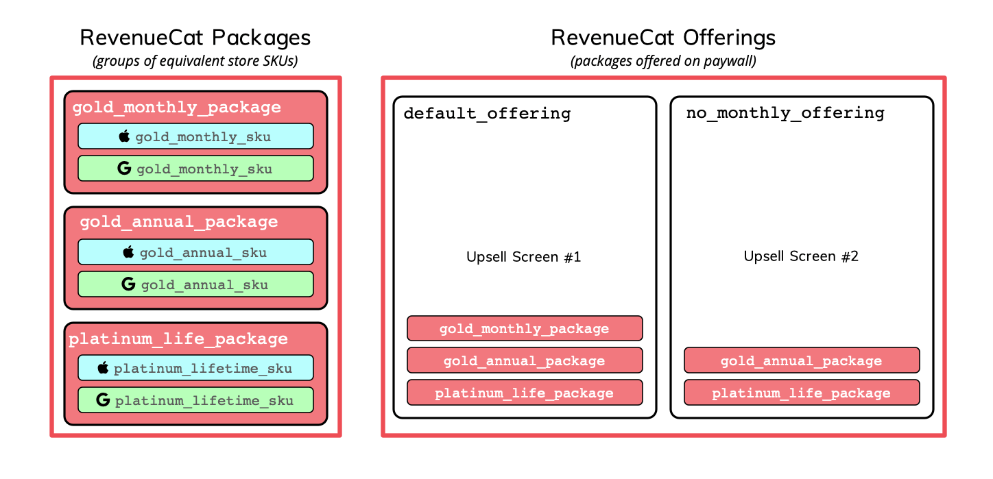 Within each Offering, there must be one or more Packages. Packages are simply a group of equivalent products across iOS, Android, and web. If your app is available on multiple platforms, then a Package would contain all of the equivalent product identifiers from each platform.