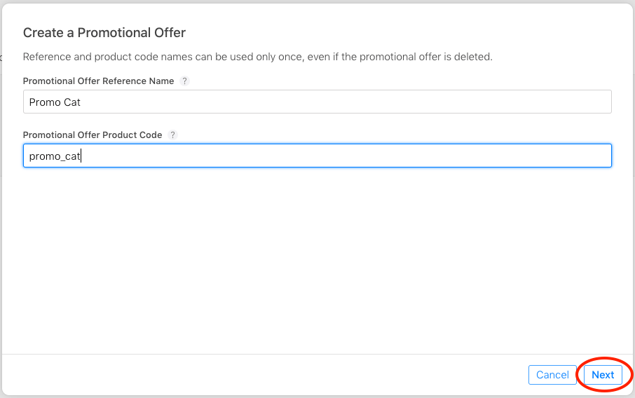 To create the offer there are two fields that you need to specify: Reference Name, which is just used for your reference, and the Promotional Offer Product Code, which is what you will actually use to activate a specific offer in your app.
