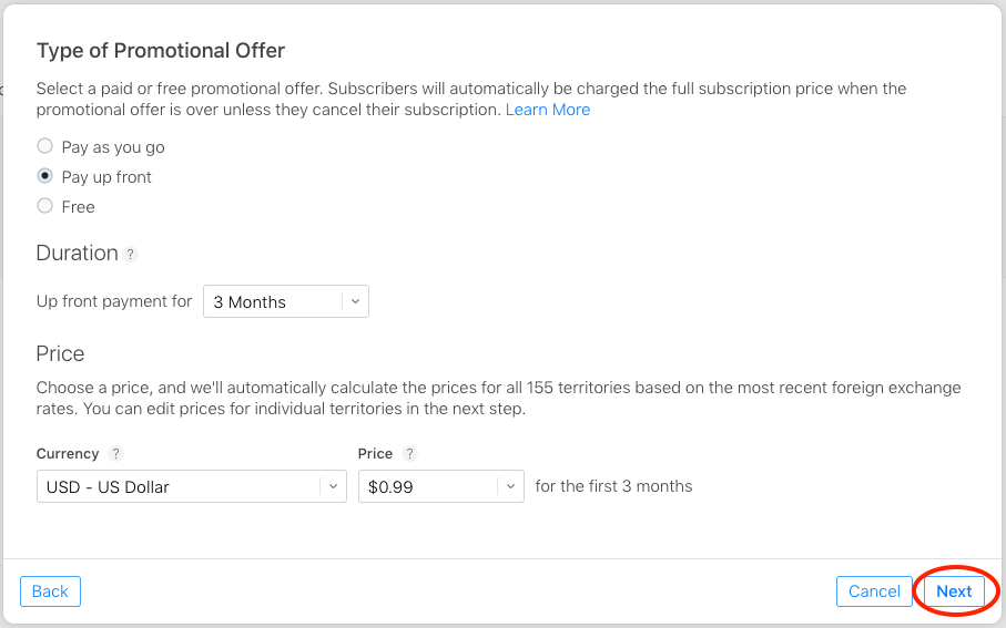 On the next screen you'll select the type of offer you wish to provide. Just like introductory offers, there are three types of Promotional Offers: