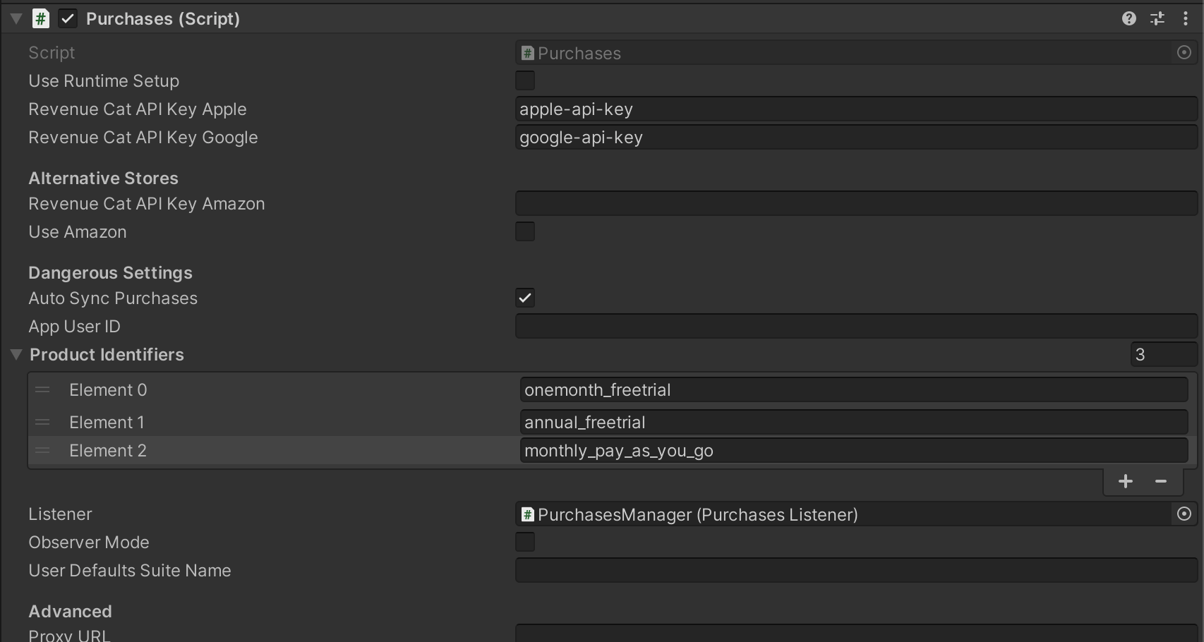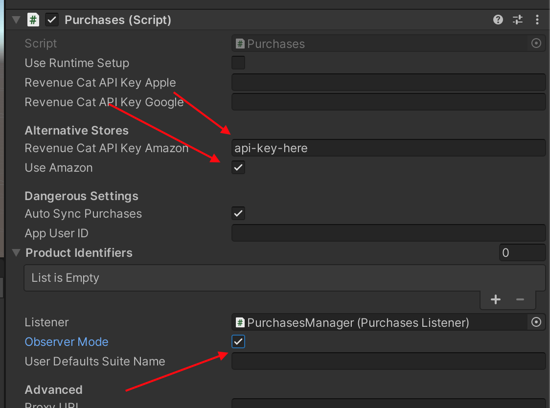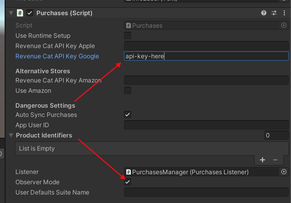 The Purchases package will include a MonoBehavior called Purchases. This will be your access point to RevenueCat from inside Unity. It should be instantiated once and kept as a singleton. You can use properties to configure your API Key, app user ID (if you have one), and product identifiers you want to fetch.