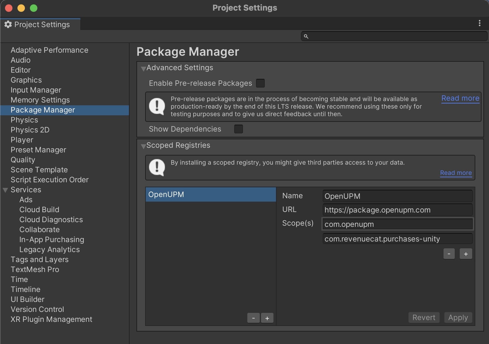 Then, you can add the OpenUPM scoped registry. To do this, go to your project's settings -> Package Manager, and add a new scoped registry with URL