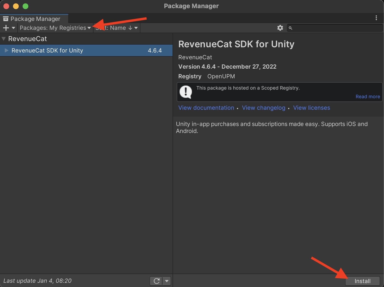 - Then, go to the Package Manager and from "My Registries", select the RevenueCat package and click on Install.