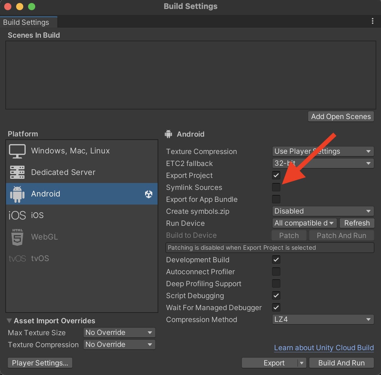 When exporting your project to Android, in the Build Settings window, make sure you uncheck the Symlink Sources checkbox. That will make it so Unity actually uses the correct source files for our SDK.