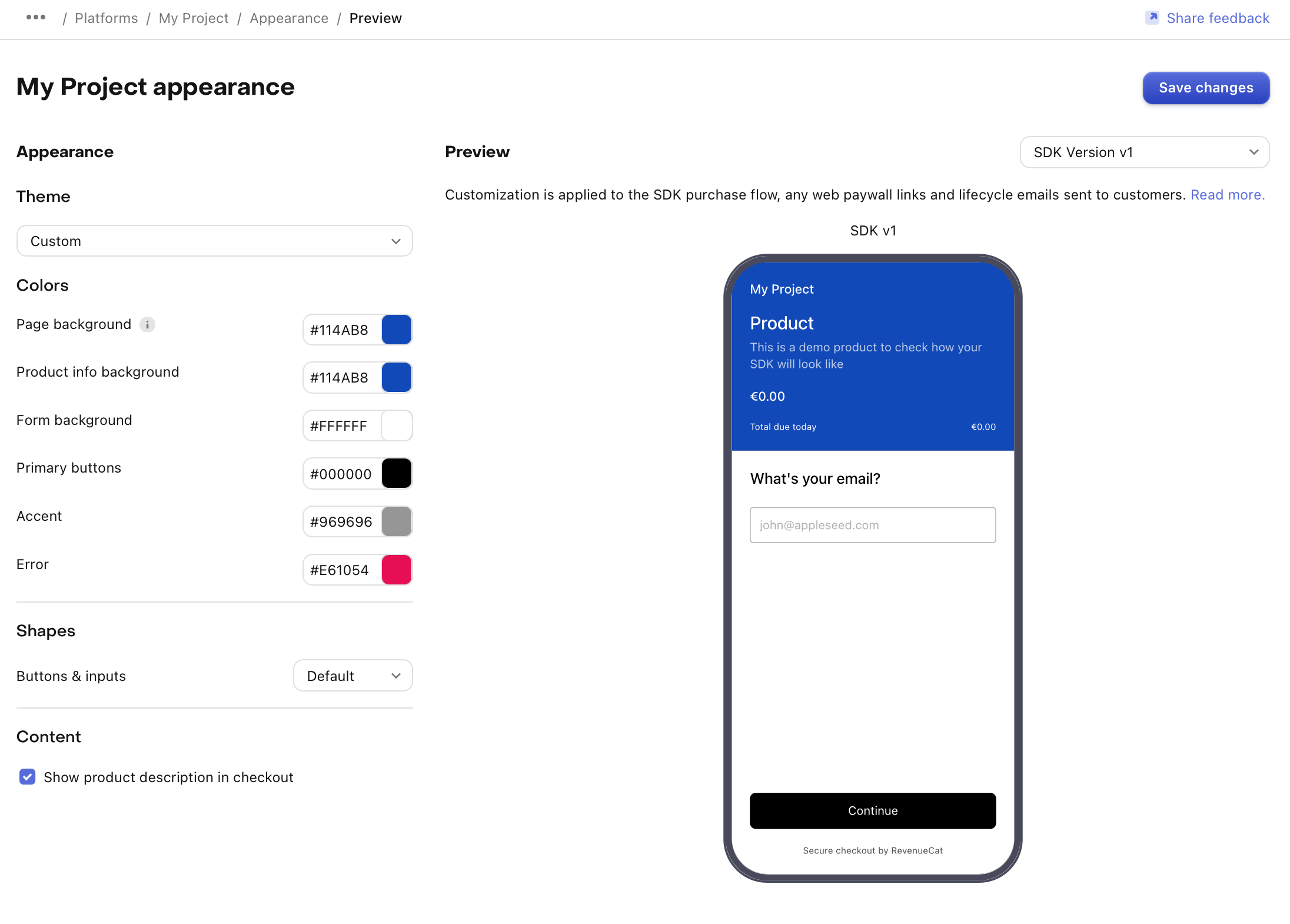 Using the appearance editor in the RevenueCat Dashboard, you can customize the appearance of the Web Billing UI to match your app's branding. This includes the colors and shapes of certain UI elements.