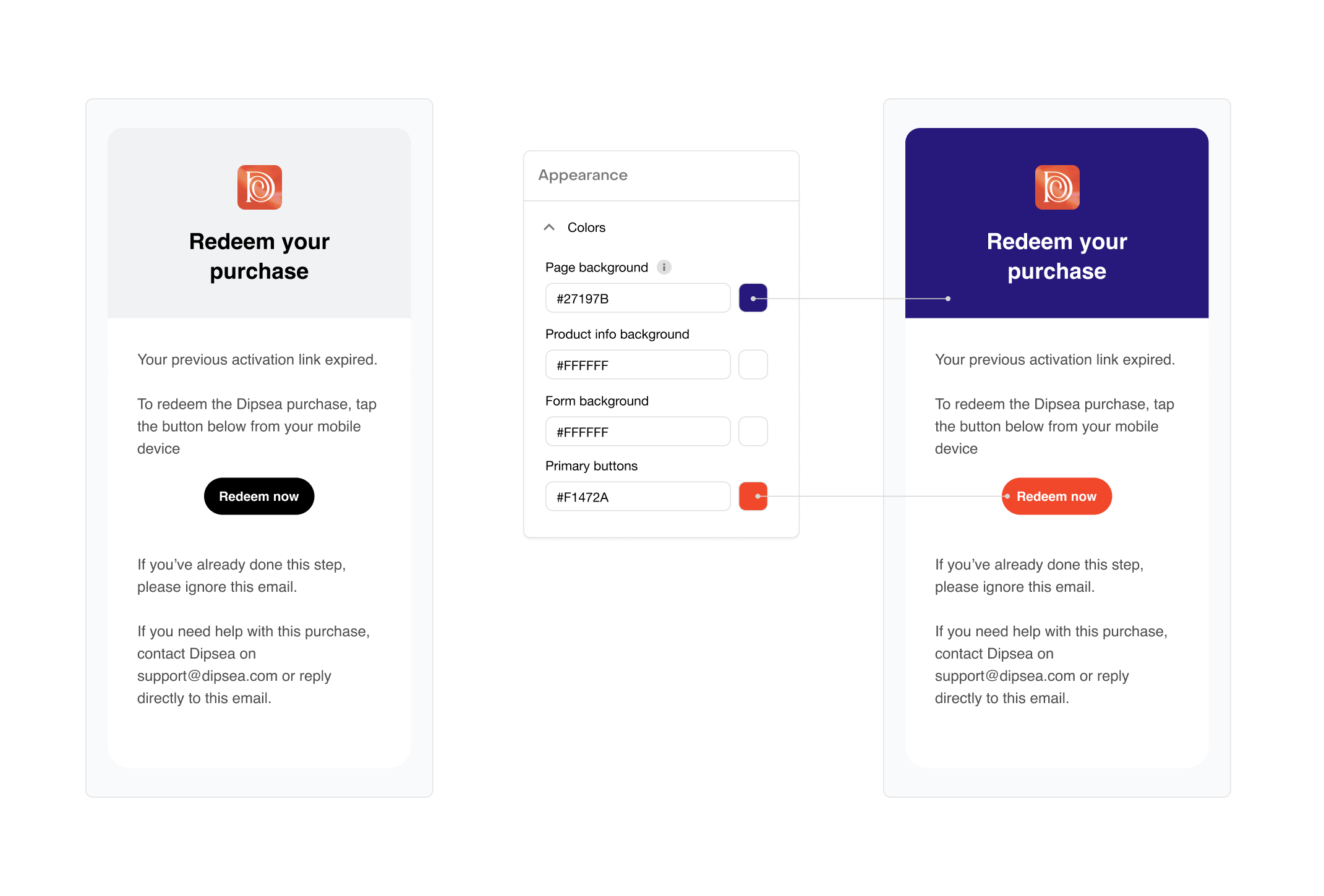 - Use your support email address as the reply-to (configured in the Web Billing app settings, if set) or