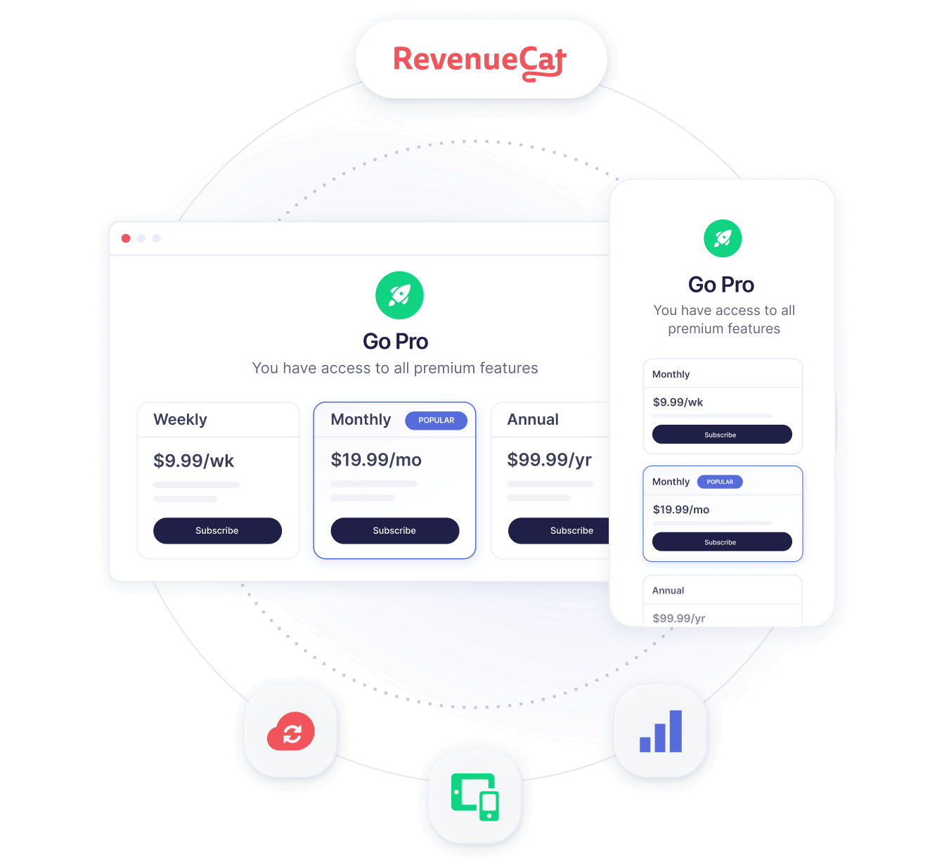 Run discounts, bundles, and regional pricing directly on the web. Update paywalls instantly in the RevenueCat dashboard, no app release required. Test messages like “Save on web” vs in-app purchase, and share Web Purchase Links in campaigns to drive conversions right away.