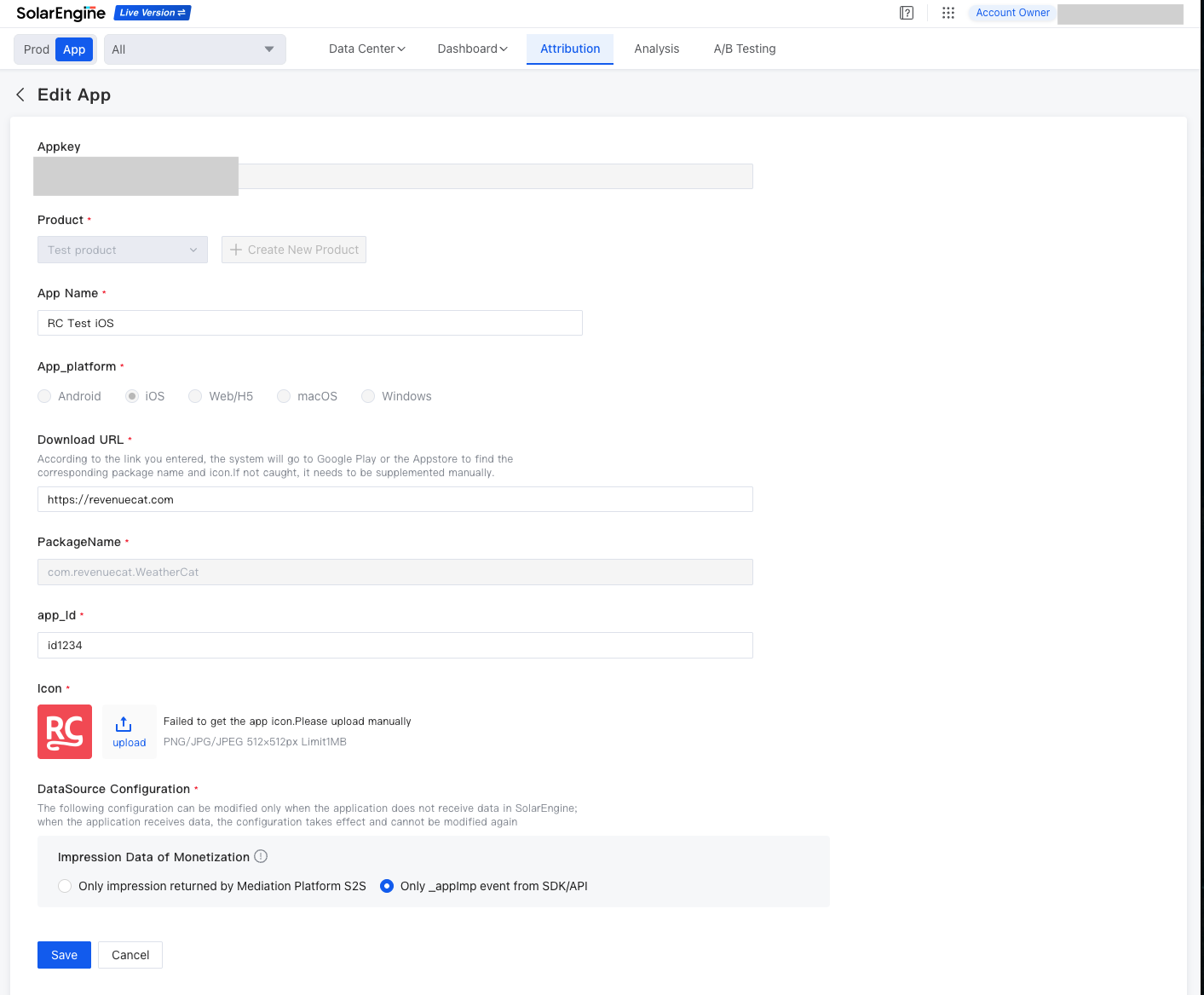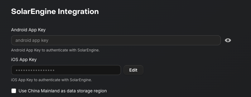 - Enter your iOS App Key and/or Android App Key. These keys authenticate requests from RevenueCat to Solar Engine. You can find them in your Solar Engine dashboard under Attribution > App > Edit App.