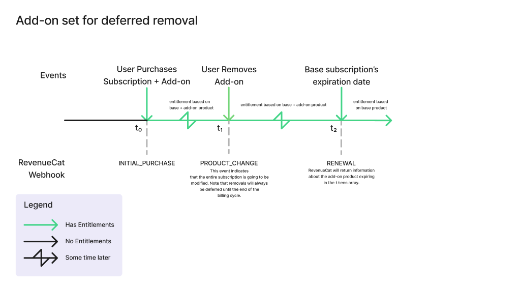 If you plan on removing an add-on and adding a new add-on within the same billing cycle, you will have both add-ons active at the same time until the end of the billing cycle. When this happens, you’ll receive an INITIAL_PURCHASE event along with the PRODUCT_CHANGE that will include all active items (including the one that was newly purchased, along with the one that is set for deferred removal). Once the RENEWAL event triggers at the end of the billing cycle, the event will contain all of the active items minus the item removed.