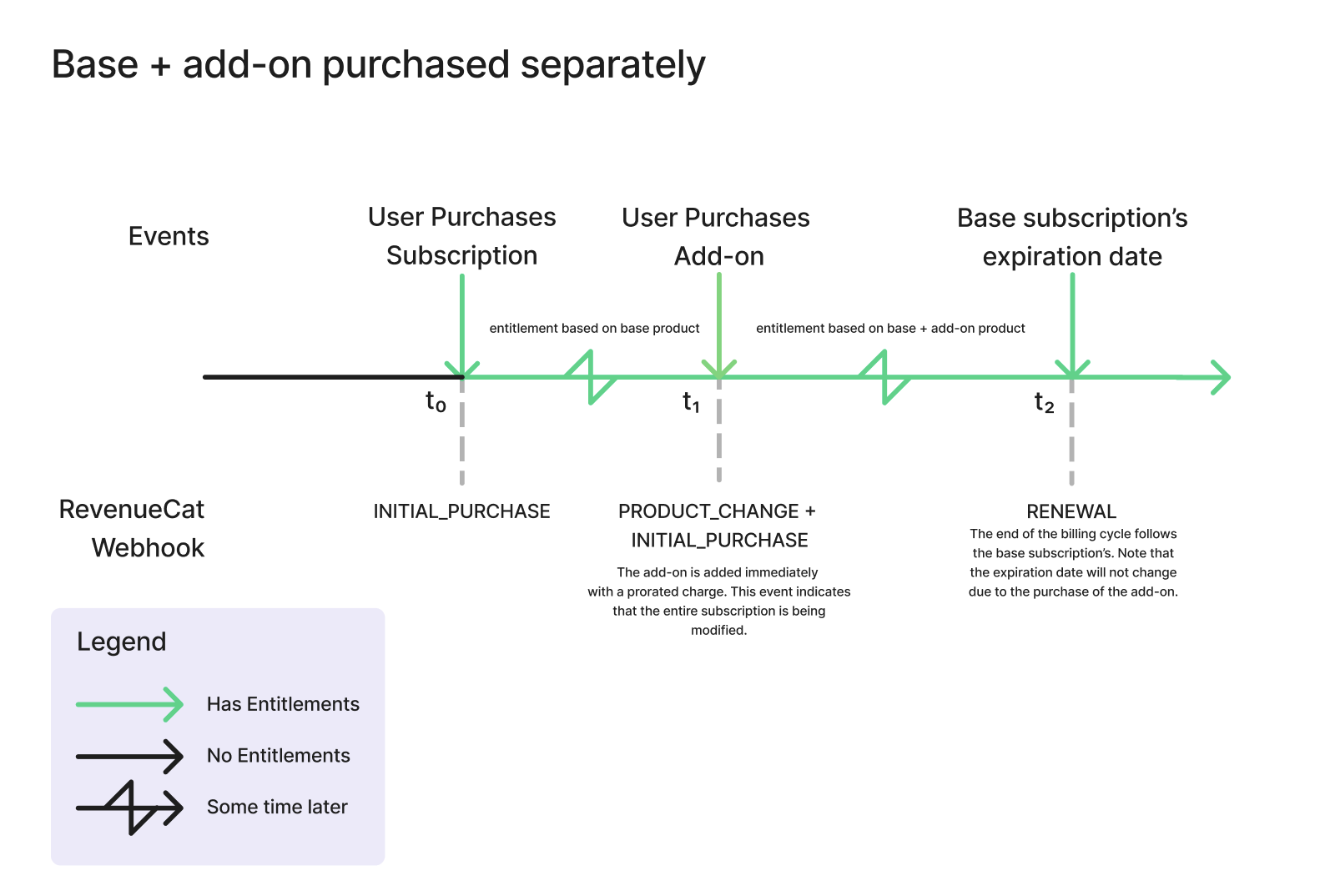 RevenueCat continues to emit the same event types you’re familiar with, no new add-on specific events are introduced. The additional details about the base subscription and its add-ons are carried in the event payload itself.