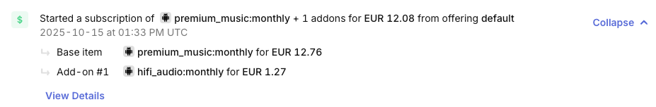 On the customer history page, the events related to subscriptions with add-ons will appear as expandable entries. Expanding an event reveals additional details, including which products are the base subscription and which ones are add-ons.