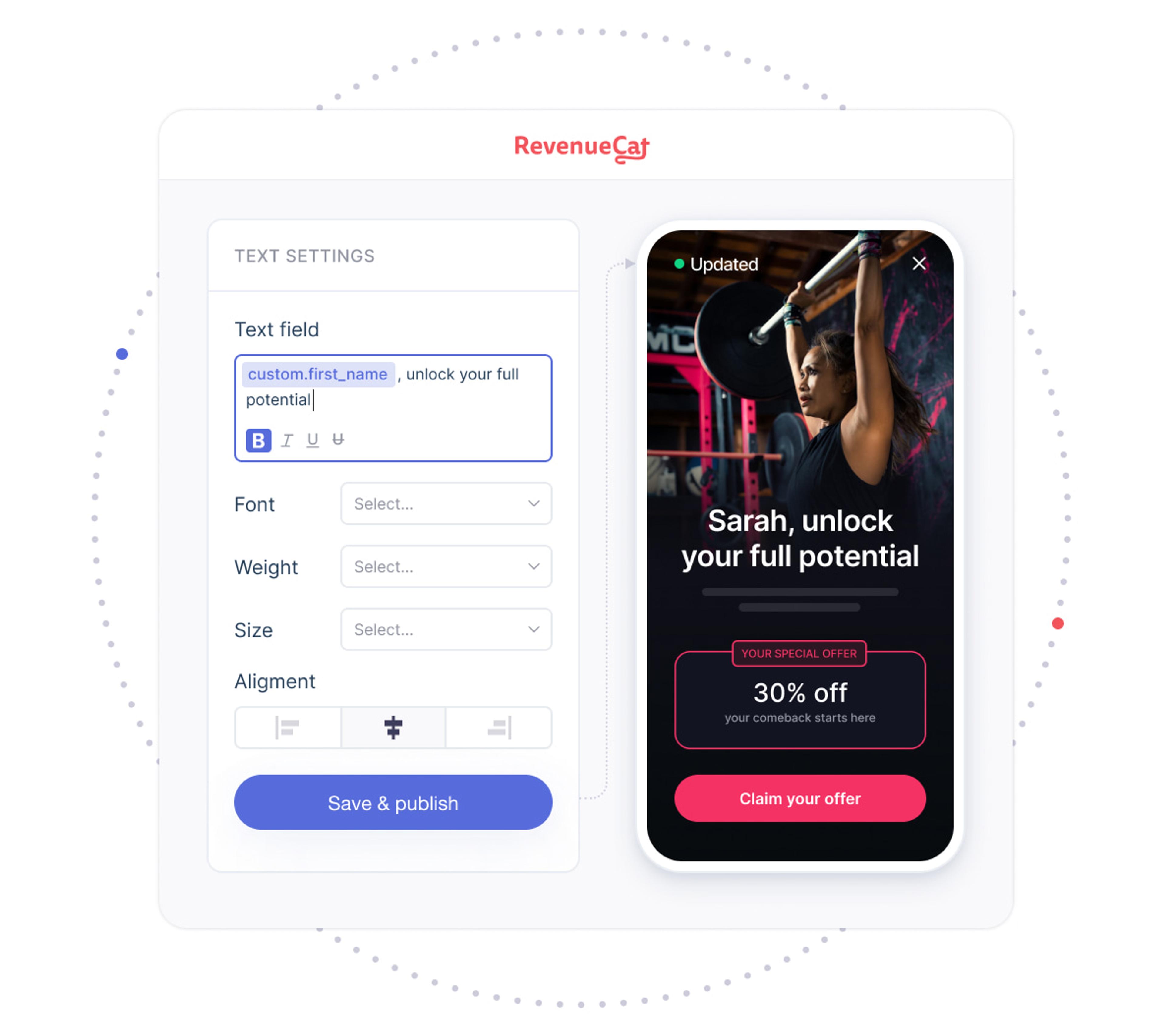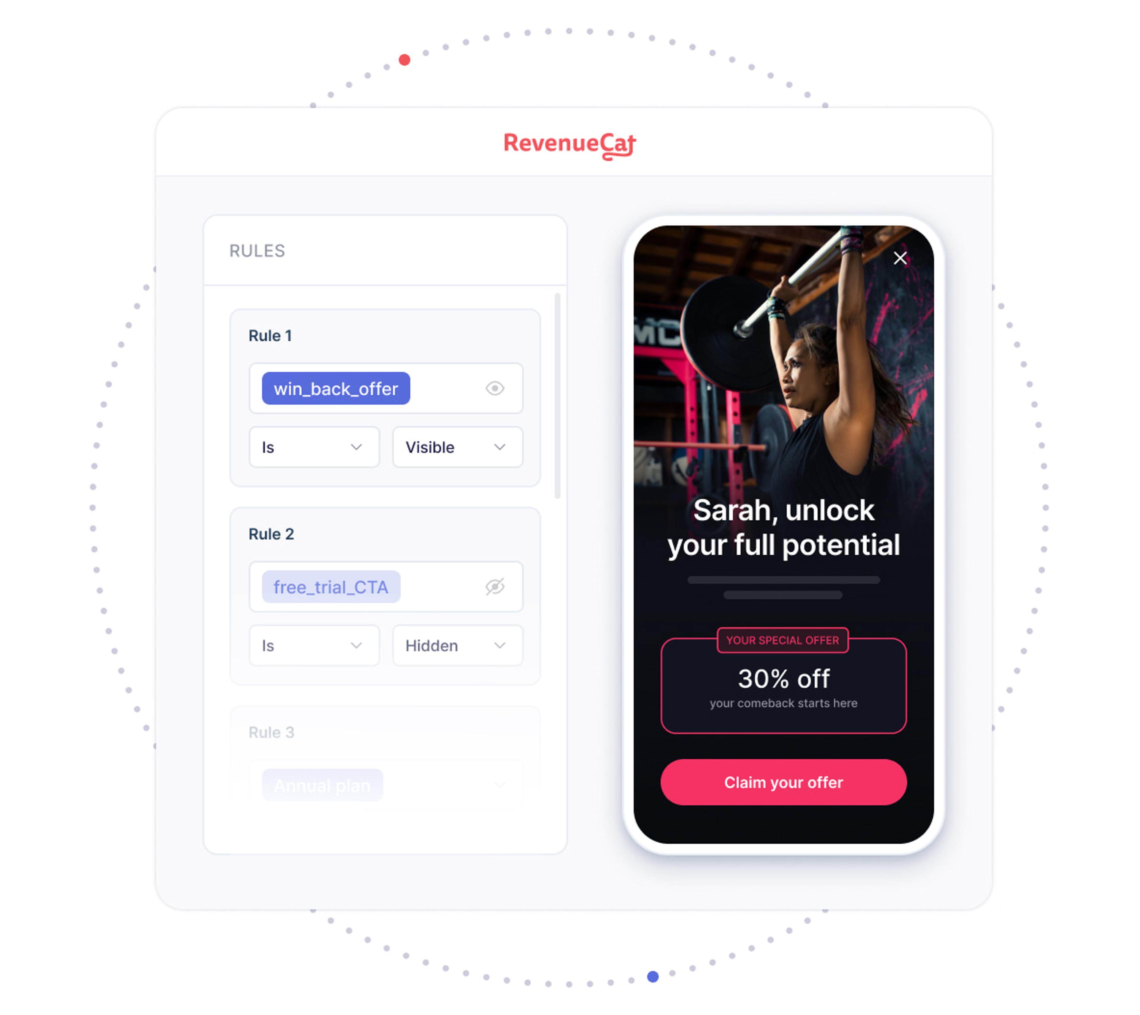 Configure personalisation logic from the RevenueCat dashboard. Changes go live immediately, across all users, on all platforms — without a build or a deploy.