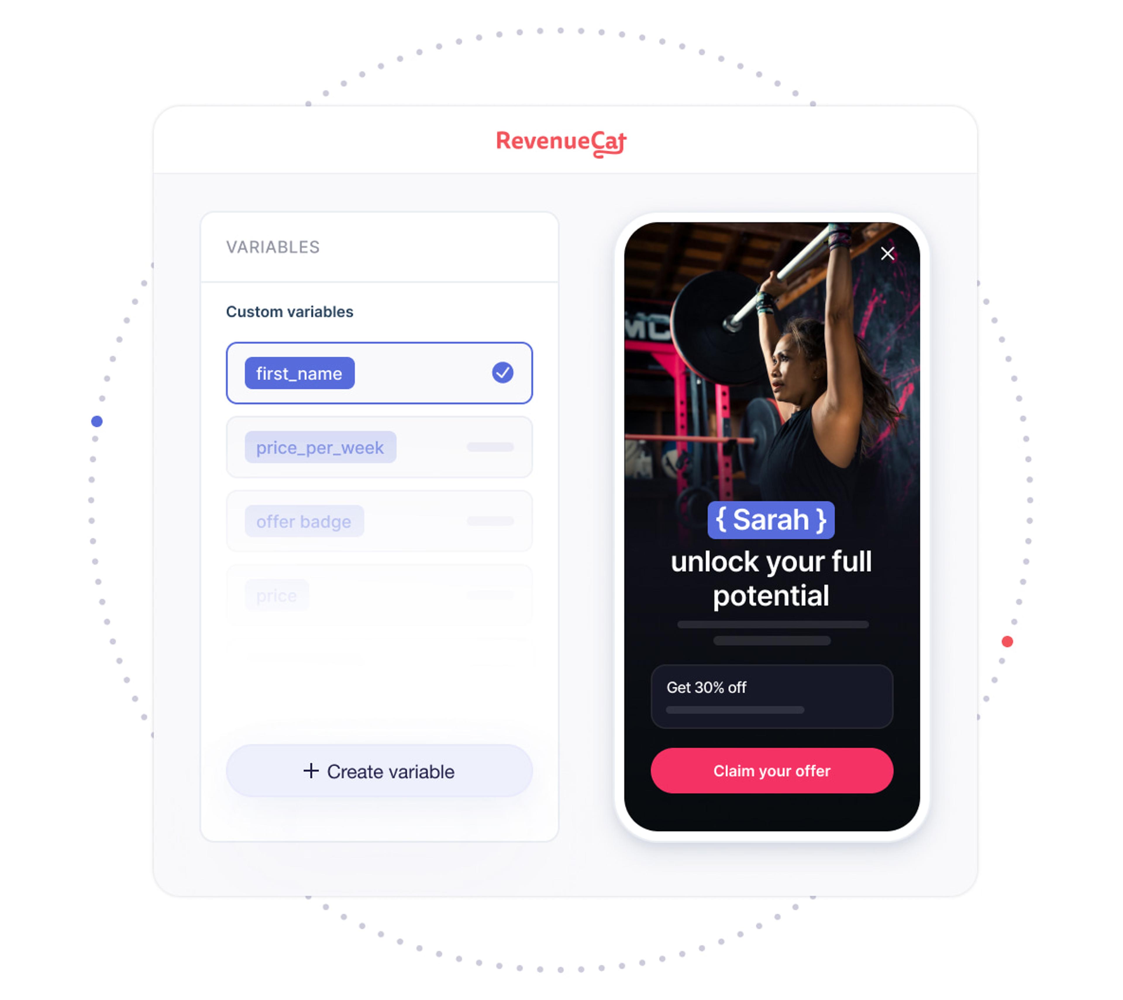 Learn about custom variablesPass any data from your app, a username, a goal, a feature name, a price, into your paywall as a variable. The paywall renders with that value substituted in. Think of it like email personalisation, but for your paywall.