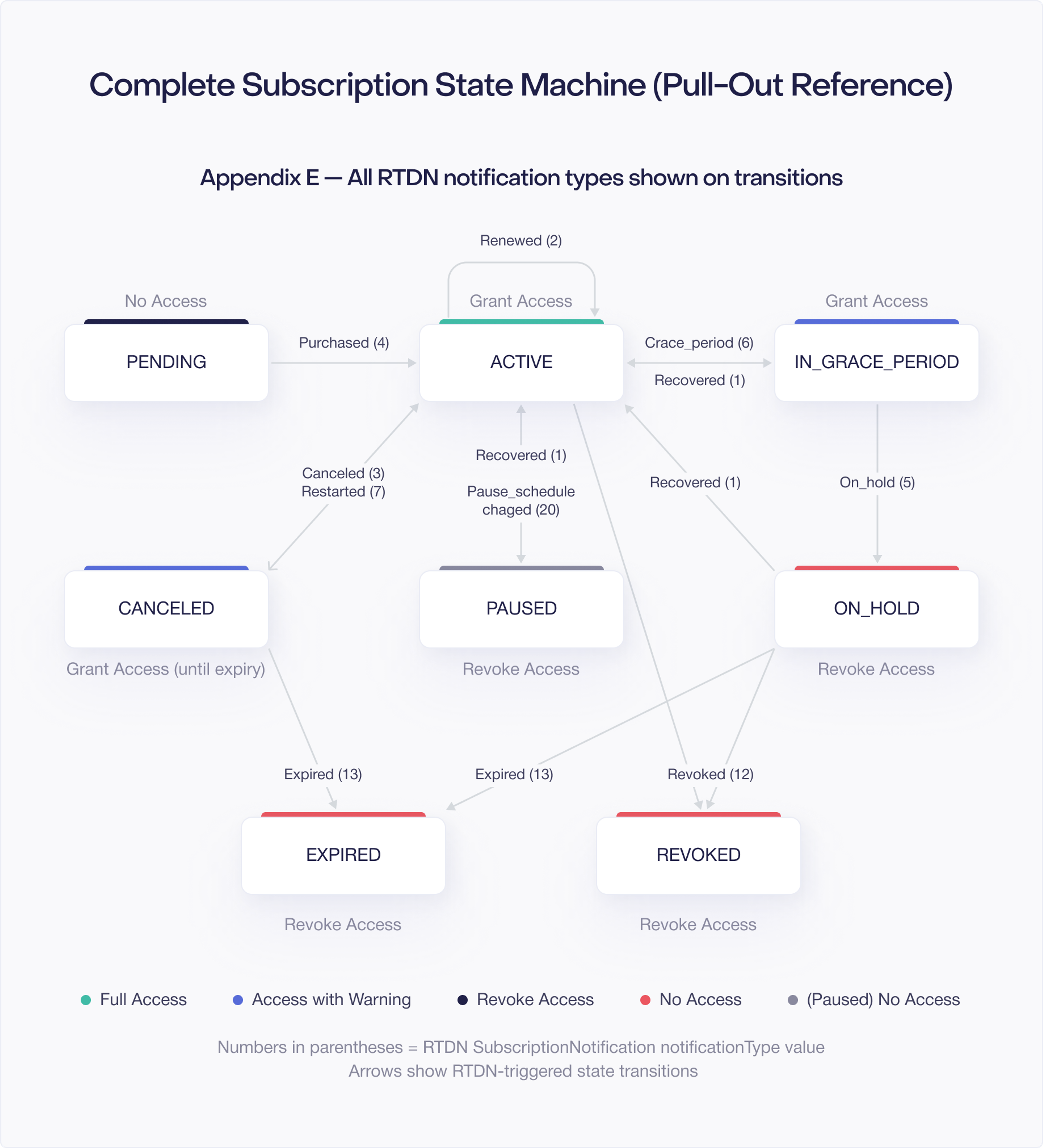 This appendix provides the complete subscription state machine as a quick reference card. Print it, pin it to your wall, or keep it open in a tab while building your billing integration.