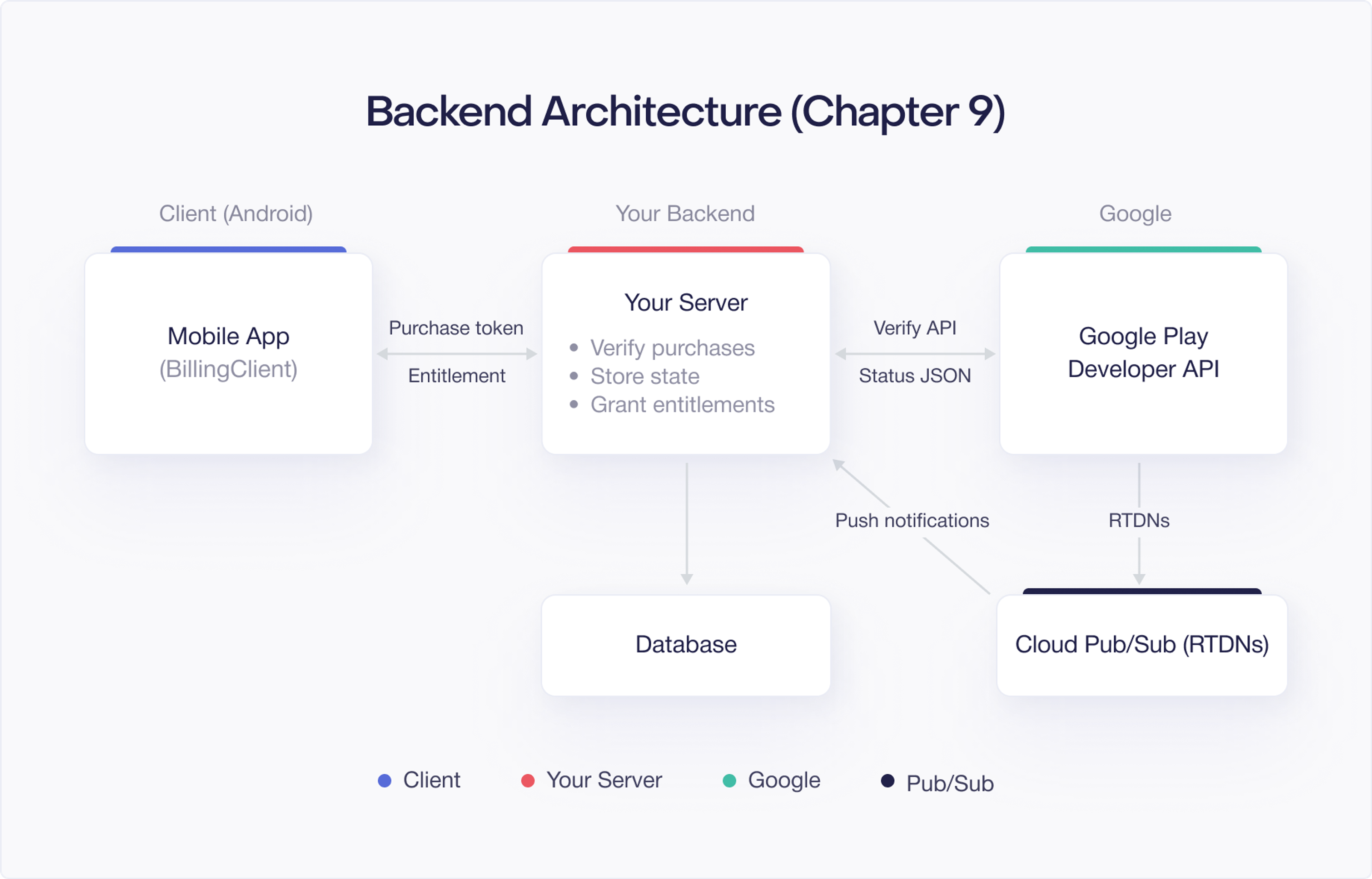 Your backend receives the token and calls the appropriate API endpoint. For subscriptions, you call purchases.subscriptionsv2.get. For one time products, you call purchases.products.get. This chapter covers both endpoints in detail later.