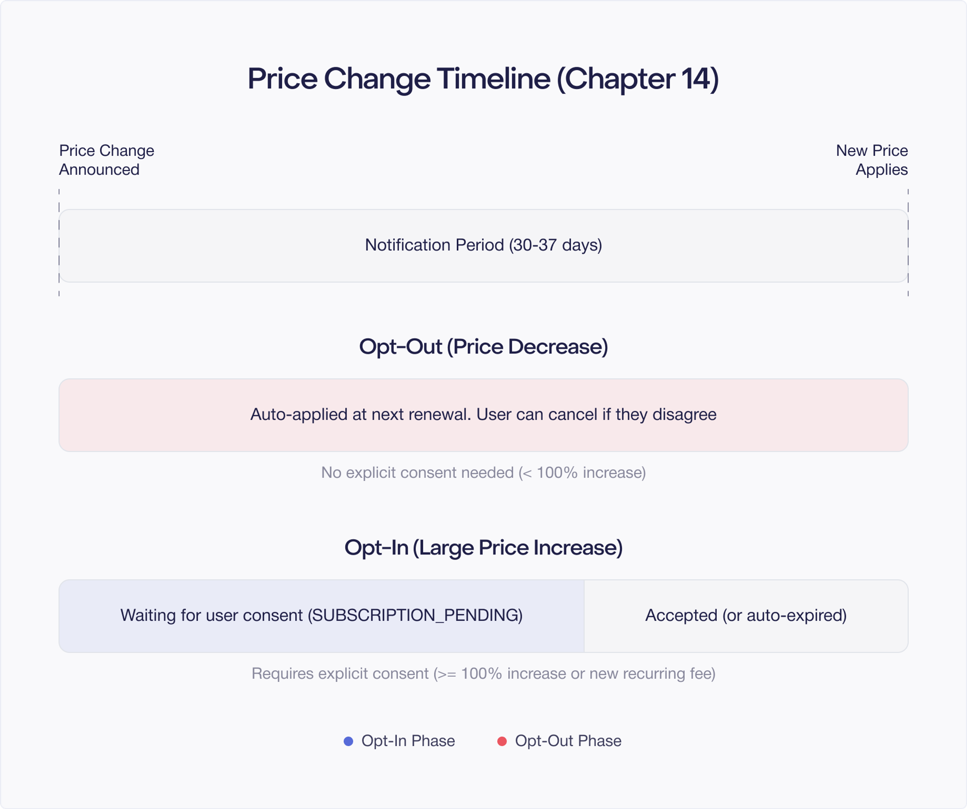 - Invalid cancellation: If the period is shorter than or equal to the notification window, the subscriber pays the lower price for at least one cycle. After that, they go through the standard price increase process (opt in or opt out) to return to the original price.