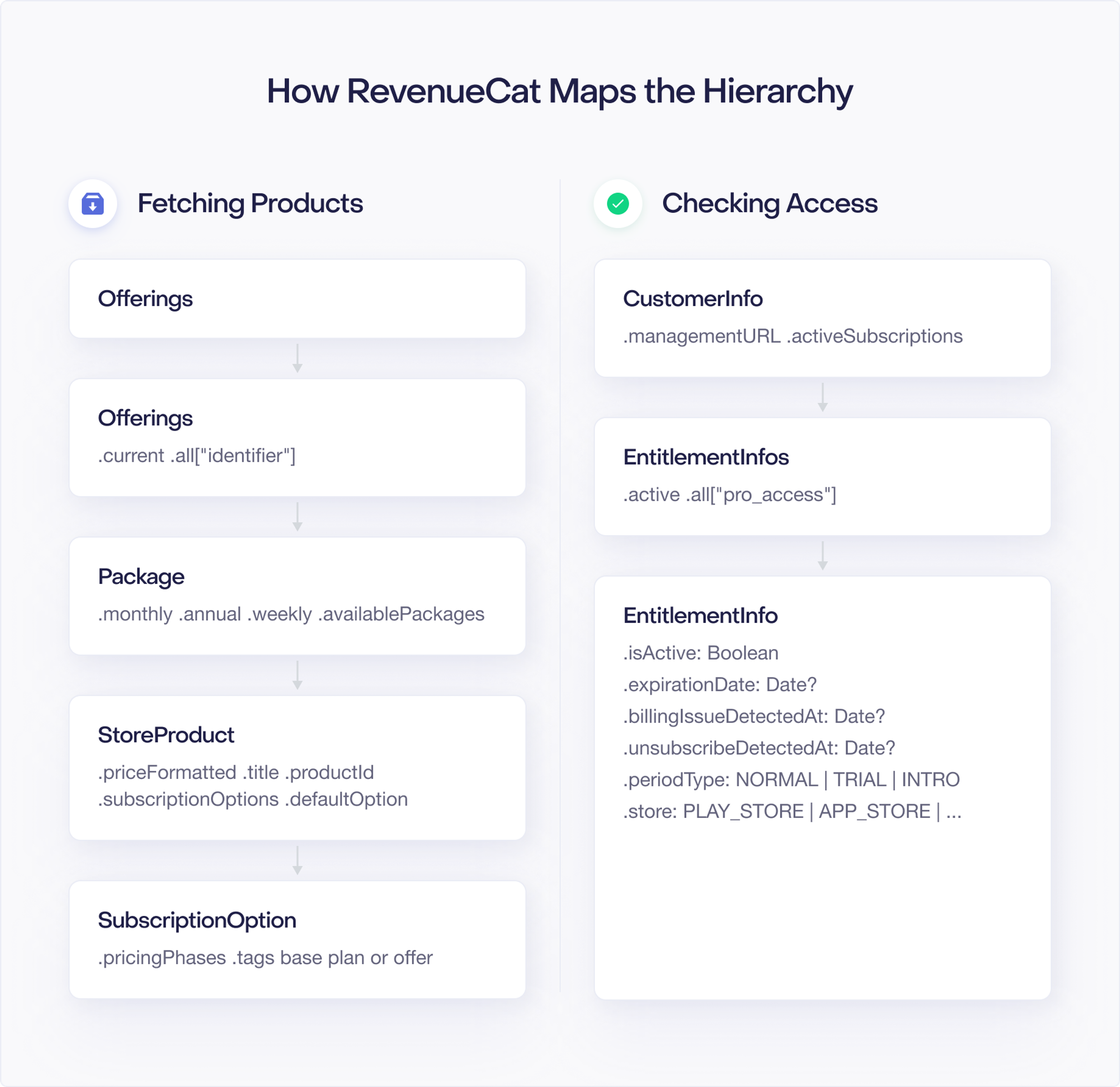 With RevenueCat, the three-tier hierarchy is still there on the Google Play side, but the SDK presents it through a simpler abstraction: Offerings → Packages → SubscriptionOptions.