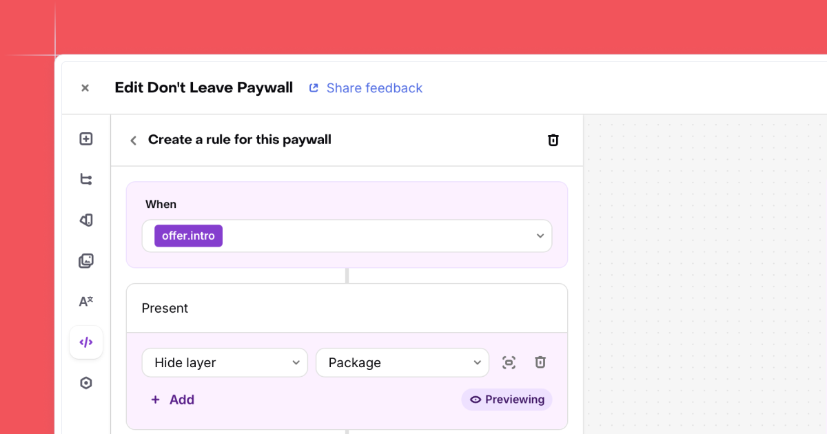 Open the Paywall logic tab in the Paywall Builder and create a rule. Pick a condition type, then choose which layers to show or hide. For intro and promo offer rules, you can also override text. The SDK evaluates all rules at render time, so your users see the right version instantly.